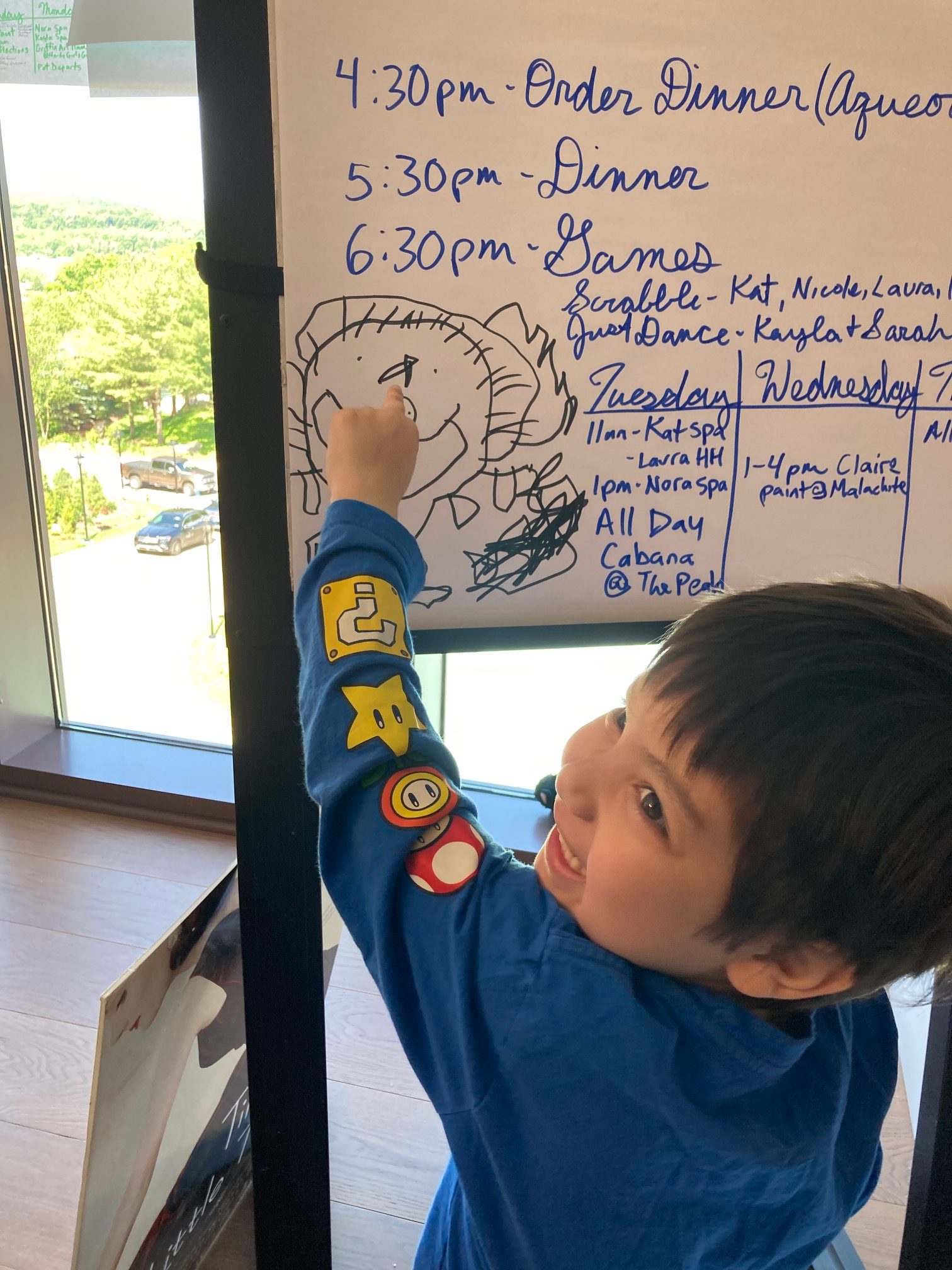 Kat makes use of the giant post-in notes and creates the day’s agenda, including the weather. More cool!
