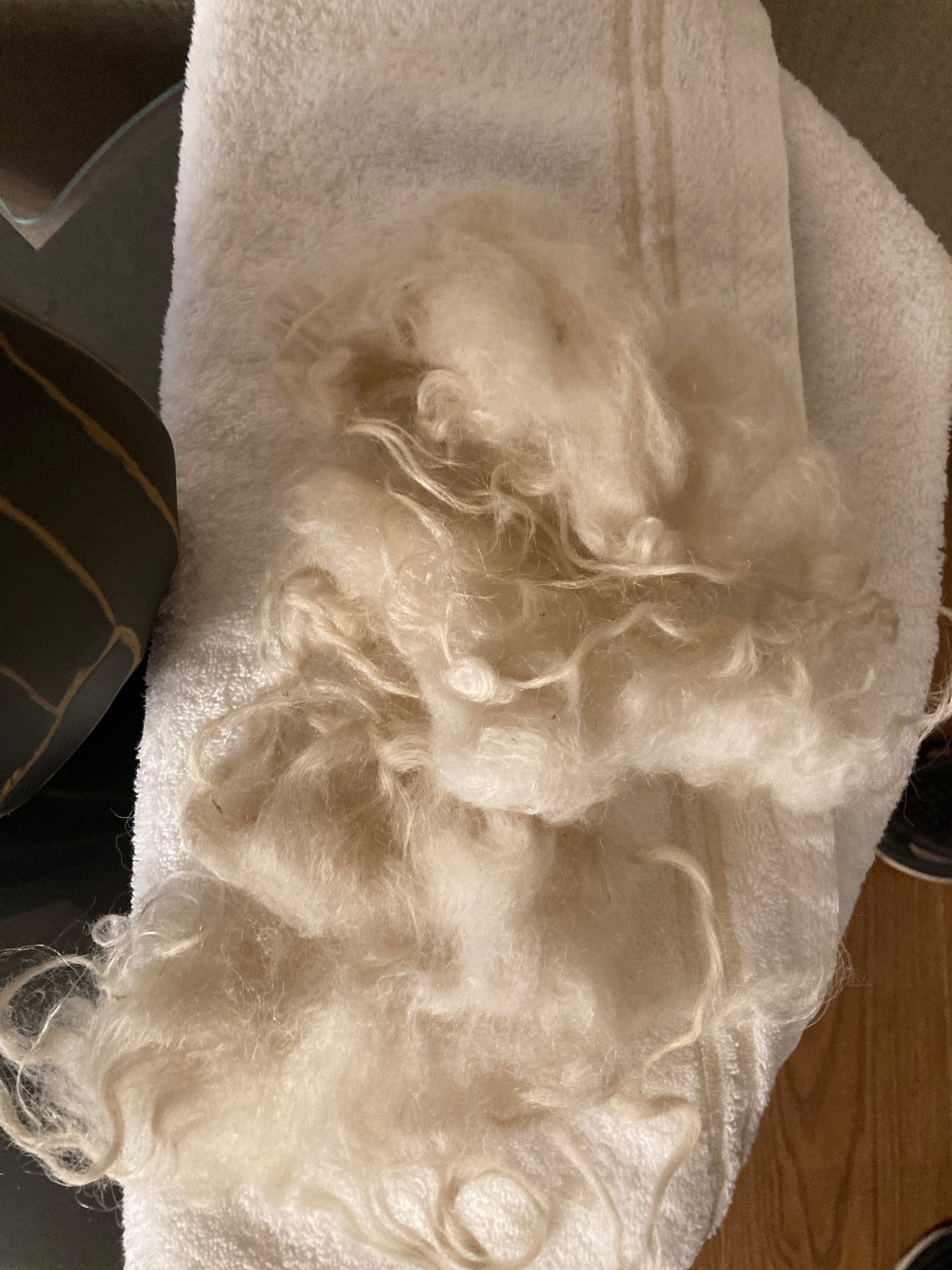 Kohler, the newly shorn sheep, as a lambUnwashed fleeceWashed fleeceFractal spun outer coatFractal spun under coatKnitted coats (top is outer/bottom is under)