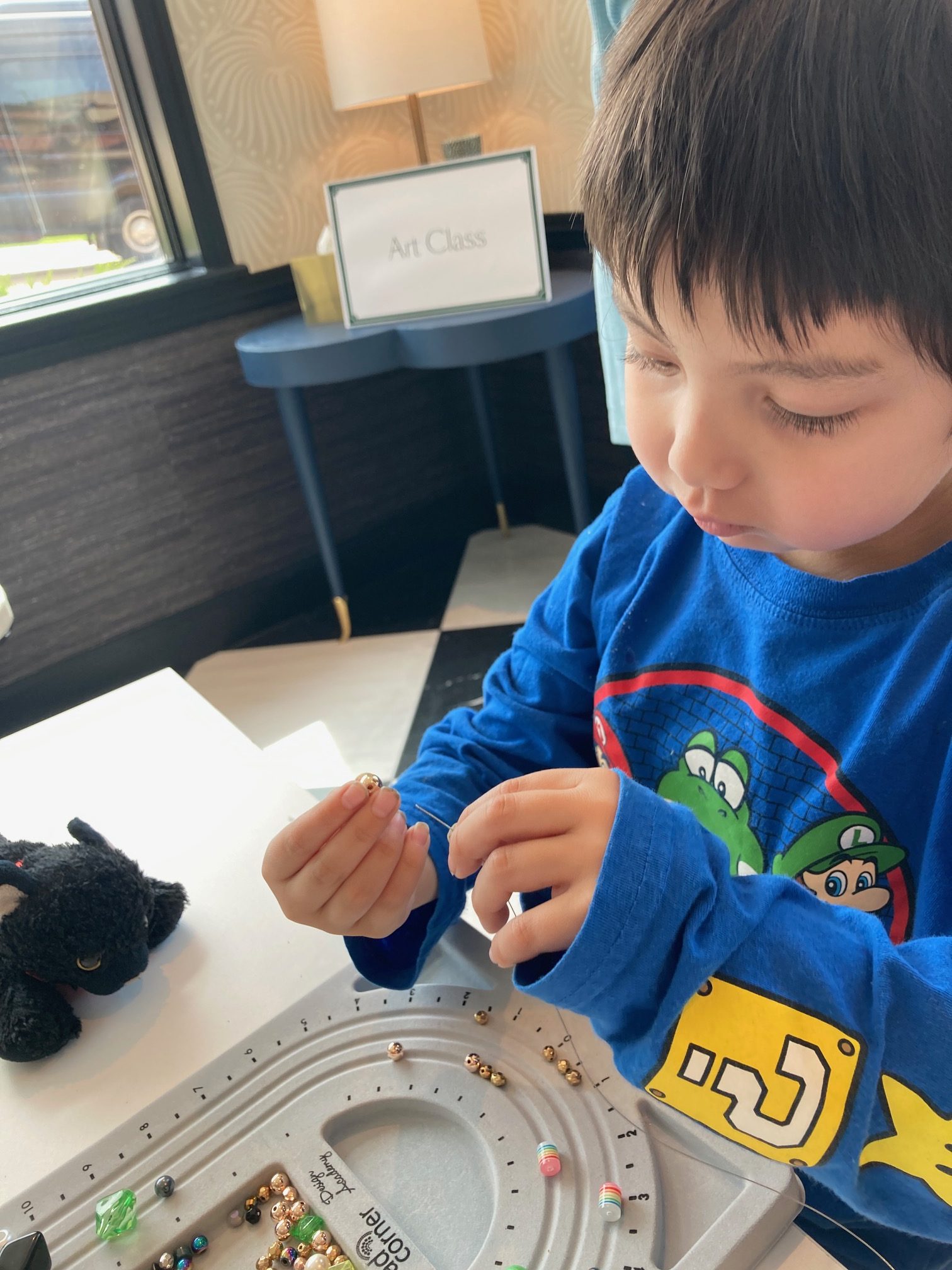 Kat arranged a jewelry making session for all interested. I made three pairs of earrings, Kat and Kayla created bracelets while Nicole made a necklace that suited her to a T. Griffin took on the challenge of finding and stringing beads for a necklace for his mom.