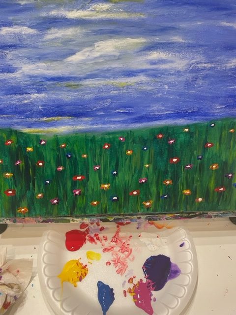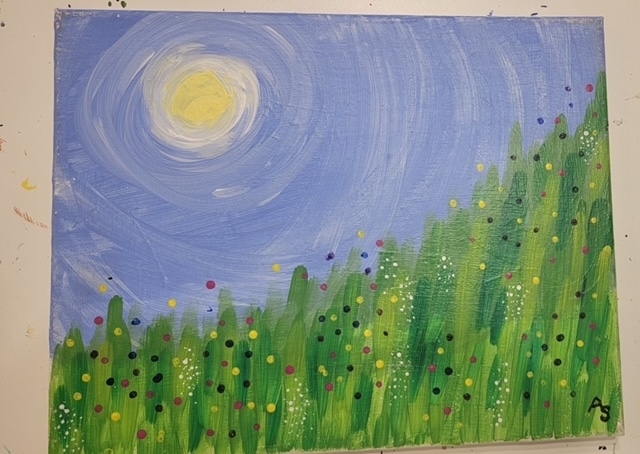 My sun looks like a six-year-old painted it–all it needs are the rays poking out. So I paint over it. No sun on my meadow! Kayla’s sun looks like it should, and even better. Jo paints over hers.