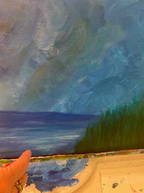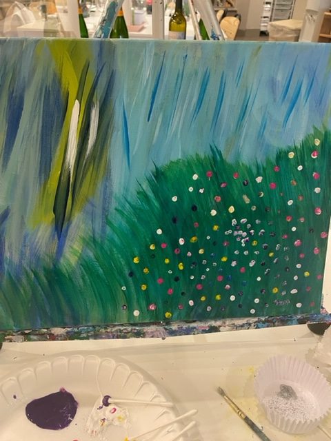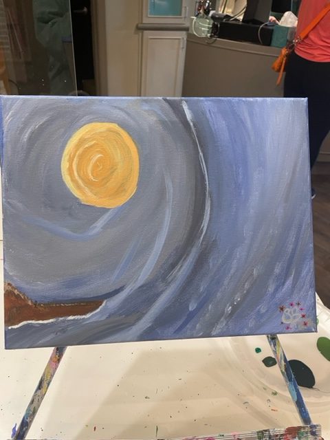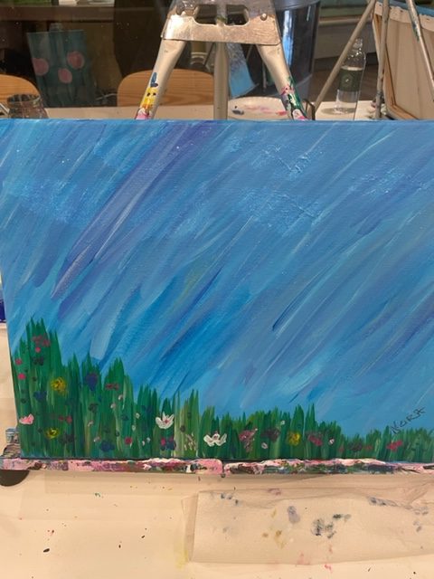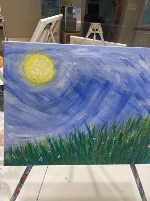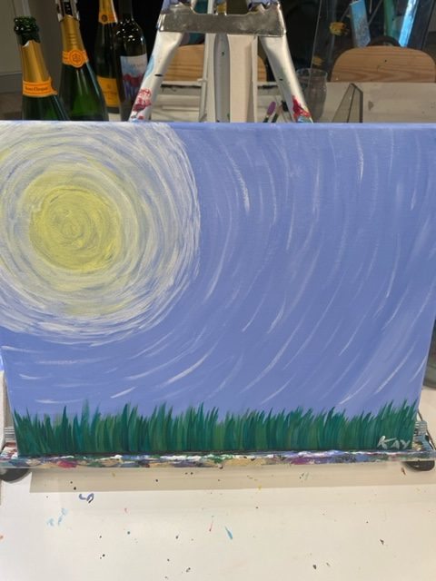 But now it’s paint time! We’ve chosen the painting–a pretty simple sun on the meadow sort of deal. I sit as far away from Kat and her genuine artistic talent as possible. I’m between Jo and Kayla, and we begin with the sky.
