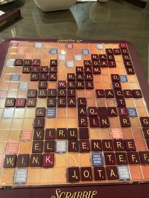 Final Scrabble–Jeanette and Kat. The tension is palpable! The board is tight, neither combatant giving way. Though Jeanette came close, Kat remains undefeated.
